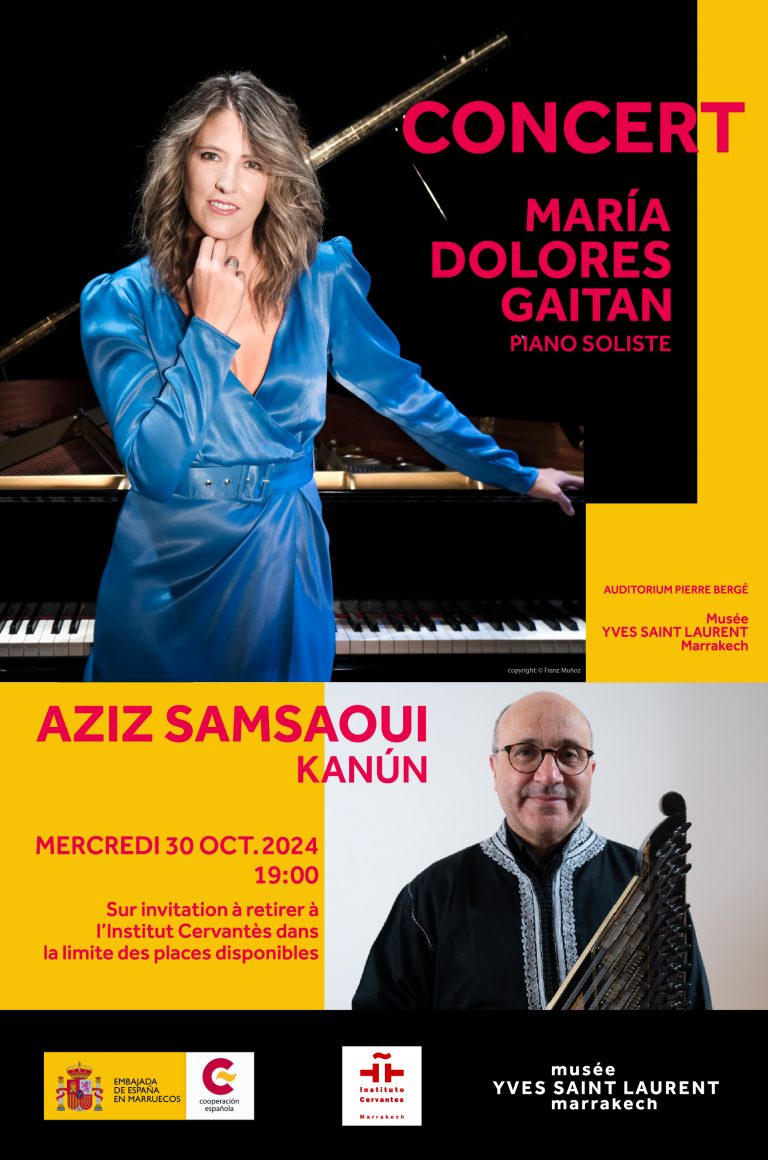 Le musée YVES SAINT LAURENT marrakech (mYSLm) est heureux de s’associer une nouvelle fois à l’Institut Cervantès et également à l’Ambassade d’Espagne au Maroc, dans le cadre d’un concert de piano et qanûn qui sera interprété respectivement par María Dolores Gaitán et Aziz Samsaoui, et présenté le mercredi 30 octobre 2024 à 19h à l’auditorium Pierre Bergé du mYSLm.